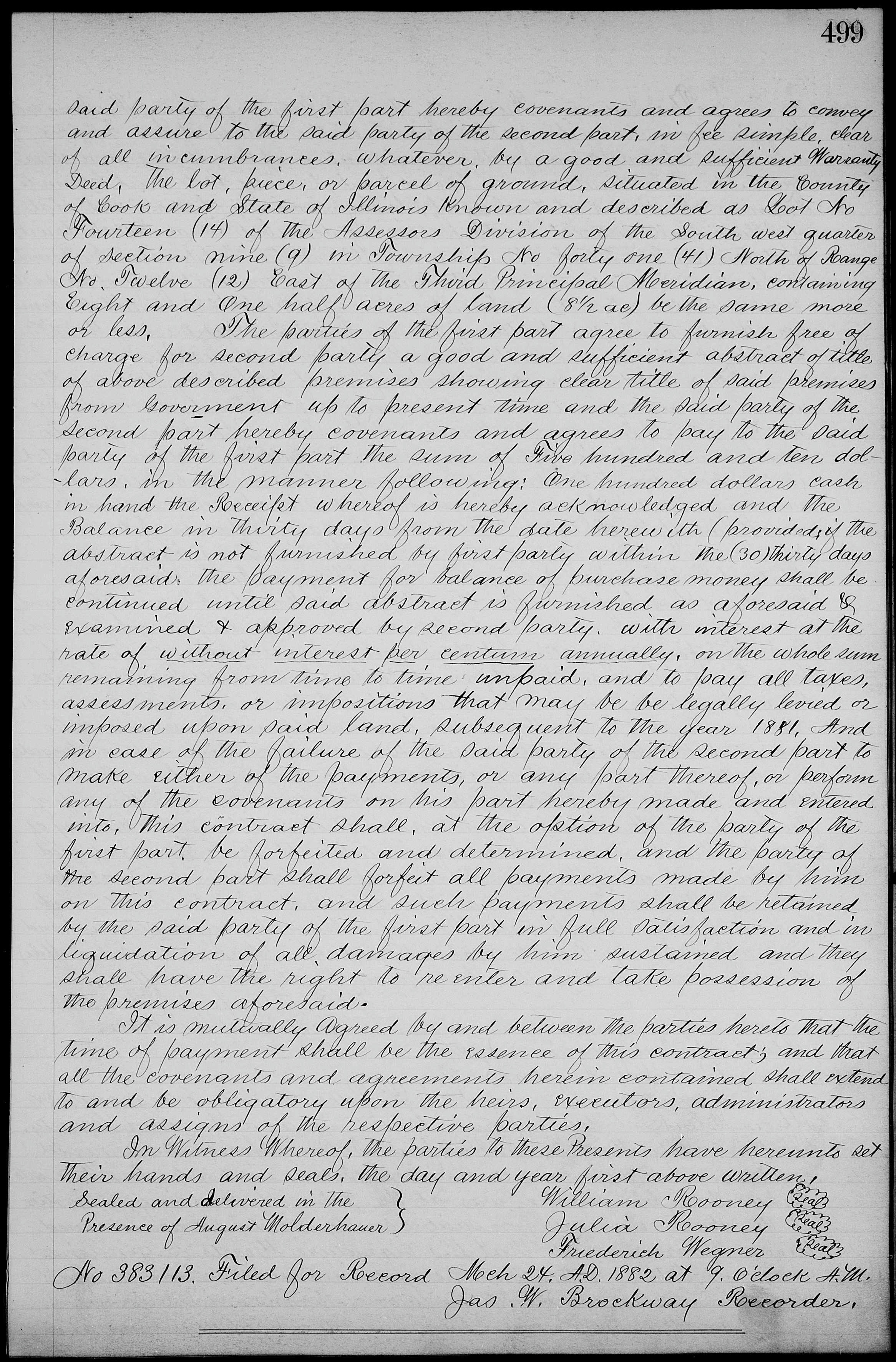 Agreement to purchase the property for $510 as follows: $100 cash in hand with the remainder within 30 days. William Rooney is required to provide an abstract of title.